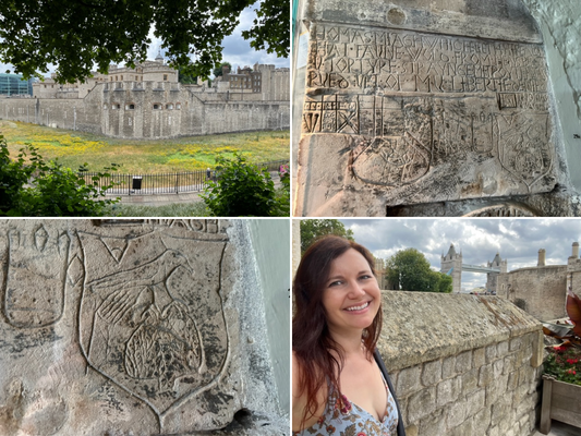 Top Left: Tower of London; Top Right: The carvings inside the Beauchamp Tower; Bottom Left: Close up of Anne Boleyn’s falcon badge; Bottom Right: Williams at the Tower with Tower Bridge behind her.