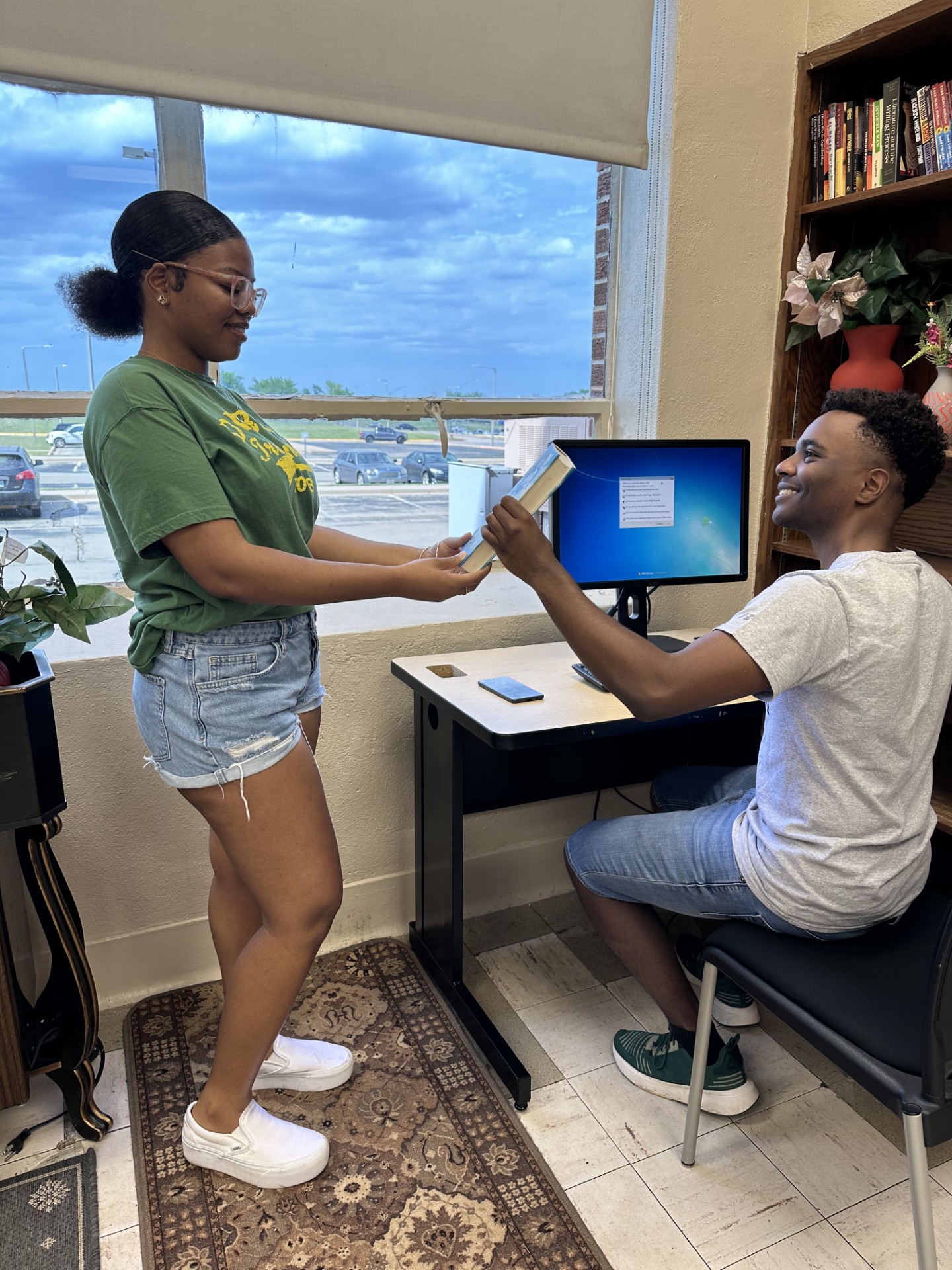 This makeover is an example of how small budgets can go a long way toward success, thanks to strategic planning and a dedicated team of students. From now on, our library will serve multiple purposes: it will be the workstation for Sigma Tau Delta members, the space for meetings among executive board members, and a place for catching up on new and old books by Black authors. Lion’s Literature is open Monday through Friday, 8 a.m. – 8 p.m. This is different from the other study halls at Langston University since they close earlier in the day. Sigma Tau Deltans will keep office hours at the library to help check out books and their schedule will be monitored by Dr. Biswas and Co-Advisor Yaisa Mann. Secretary Joshua Thompson will maintain a record of book purchases, check-outs, and check-ins and create schedules for meetings and events hosted by the chapter. Treasurer Jaiden Brown will help Thompson maintain the schedule in alternating shifts. The two newly acquired computers will be used to maintain a log of chapter members’ office hours.