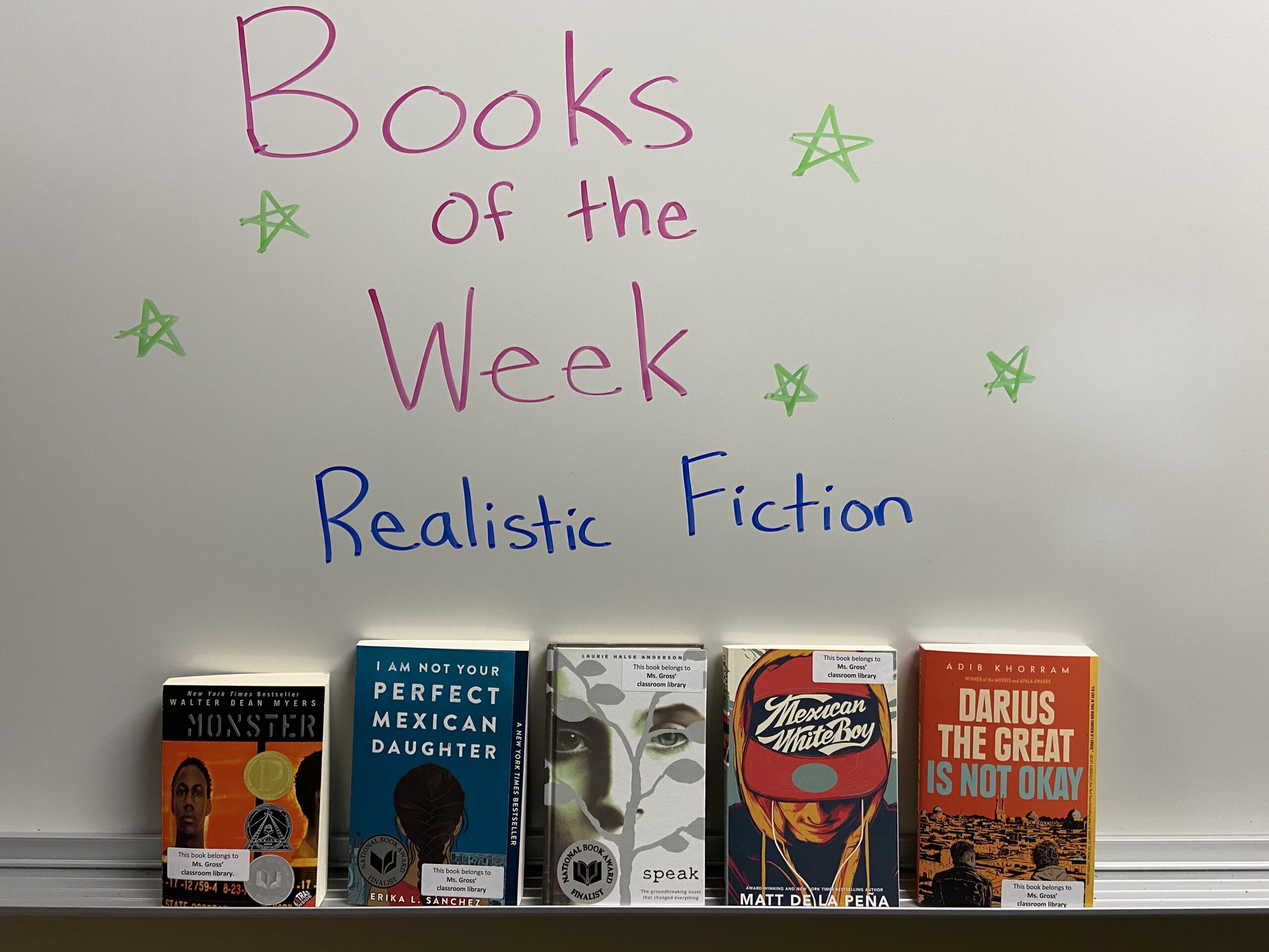 Independent reading is an important component of my English classes, and I love having a selection of literature in my classroom for students to read. My library includes books from a variety of different genres, so all students can find something that interests them. To promote my classroom library, I made a books-of-the-week display at the front of my room that showcases stories from different genres. I select new books-of-the-week from my library every Monday, and by Friday many of the featured books have been checked out. It’s wonderful to see that students are reading the books and enjoying them.