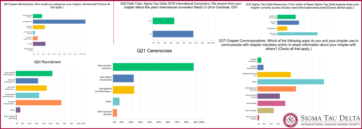 Sigma Tau Delta’s annual chapter report/survey was emailed to Lead Advisors in mid-April and confirms what we already know—chapters of all sizes and funding levels are doing very impressive things. Assembling the materials is a good way for chapters to pull together and assess their year’s work; collating the responses allows the Central Office to provide Advisors with interesting answers to questions such as “what does a ‘typical’ Sigma Tau Delta chapter look like?” and “what can our chapter do this year that has been successfully tried, proved exciting, and will engage our members?”
