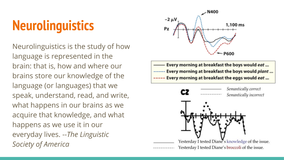Well, in Fall 2017, I was working as a Supplemental Instruction (SI) facilitator for my favorite class, Standard English Grammar, and taking Neuroscience at the same time. That semester, immersing myself in what would become the start of my interdisciplinary studies dual major, my passion for syntax evolved into an intense curiosity toward the brain’s linguistic mechanisms. My final course paper, “Representation of Words in the Brain,” sparked a career-inspiring discussion during office hours with my Neuroscience professor, Troy Smith.