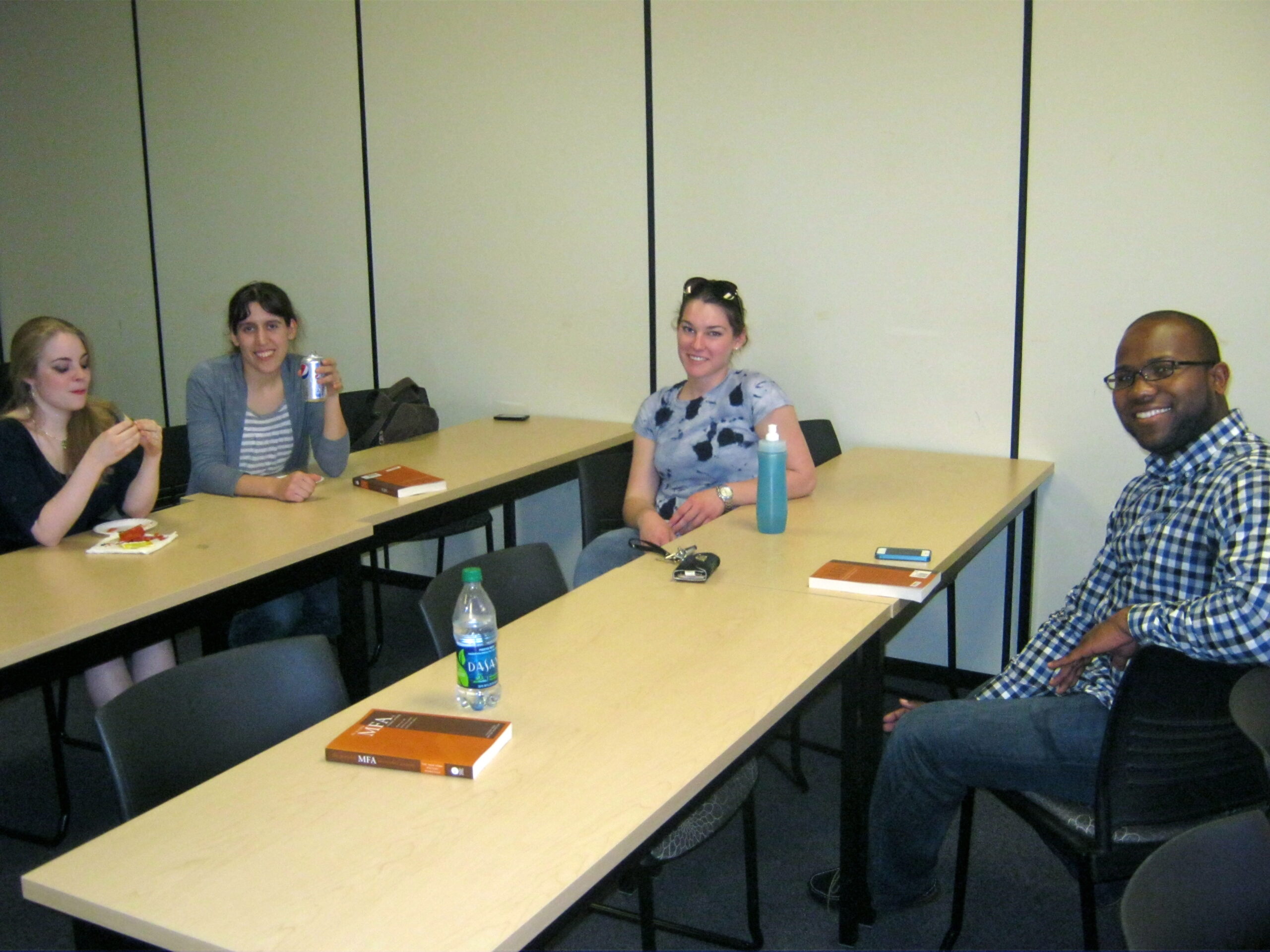 Sigma Tau Delta members meet with the veterans in the Veterans Lounge for pizza and to distribute the workshop materials.