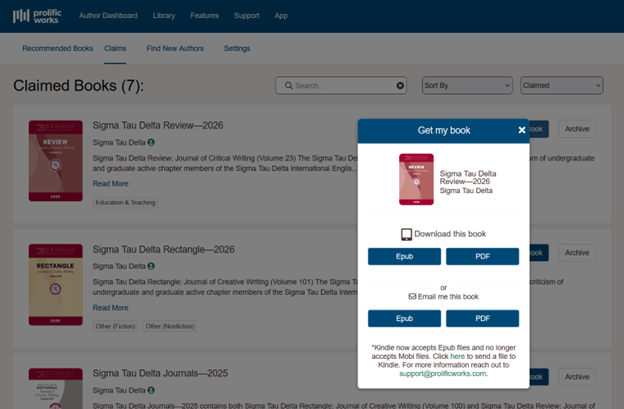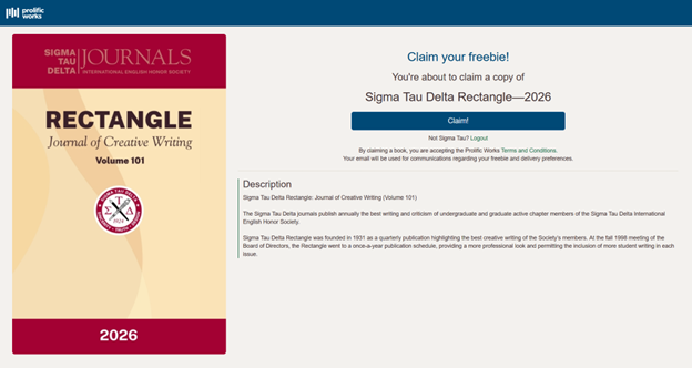 The e-reader-friendly versions of the 2026 Sigma Tau Delta Journals can be claimed for free through Prolific Works, a free platform for sharing e-books—you will need to create a simple, free account to claim books through Prolific Works. Once you’ve followed the link to the 2026 Rectangle or the 2026 Review simply “claim” the book.