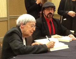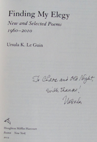 In the short time I spent sitting next to Ursula, as she prefers I address her, during the book signing portion of the event, we became a little more than acquaintances. She scolded me for presenting the wrong title page to sign, and we chatted amiably between signatures. When I slipped my own book in front of the weathered hand that had penned so many masterpieces, she saw the little Post-it note bearing the name Chaos. She looked over at me and said, “There can’t be two of you.” I told her I was shamelessly using my position to jump the line. She grinned and signed my copy of Finding My Elegy, “To Chaos and Old Night, with thanks! Ursula.” The reference to Milton’s Paradise Lost was not lost on this old poet. I have never been more honored.