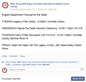 Our page posts English related articles and engaging memes for the enjoyment of members and fellow English lovers alike. My favorite function of our page is the “English Department Forecast for the Week.” This weekly forecast is a hub of information for the entire English Department—times, dates, and locations for all department related events in one place. This function also increases our chapter’s positive image in the English Department and around campus and illustrates our steadfast dedication and support for all things English on campus and in the community.