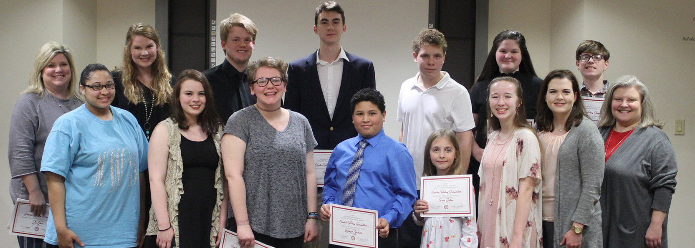 In early August 2017, we sent out a letter and application form to all the language arts teachers in the middle schools and high schools in Tippah County, MS, where Blue Mountain College (BMC) is located, inviting them to urge their students to enter our writing contest. Students could enter poetry, short stories, creative non-fiction, and critical analysis essays. The deadline for submission was February 1, 2018. We received 64 submissions and awarded a first and second place winner in each category and grade division, pairing the grades in 5-6, 7-8, 9-10, and 11-12. On March 27, 2018, we held a reading and reception for the winners, their teachers, family, and school administration at the BMC campus. The lecture hall where the readings were held was packed. Our chapter members, who served as the contest judges, also participated in the program by calling out the winners in the categories and grade levels they judged and presenting them with a certificate of merit and a booklet of all the winners’ works.